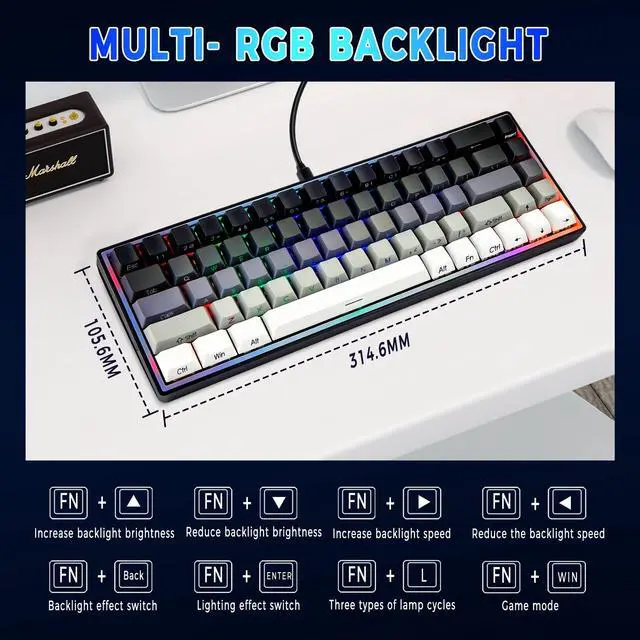 Compact 68-Key Mechanical Gaming Keyboard Designed with a space-saving 68 key mechanical keyboard layout, this compact mechanical keyboard frees up desk space while keeping essential keys for FPS, MOBA and daily typingideal for minimalist setups and competitive gamers.