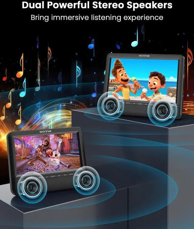2 x Car DVD PlayerWONNIE new generation 7.5" car dvd player dual screen adopt newly upgraded chip, providing crystal clearer image, playing discs stablely even during bumpy rides. The car dvd player supports to play two different movies for kids or playing the same movie simply via AV cable connecting(Come with 2 IN 1 car charger,, without built-in battery, only for car use) ^^ Dual Powerful Clearer Stereo SpeakersWONNIE dvd player for car has two upgraded powerful speakers that provides louder & clearer stereo sound, attract children's full attention and make kids immersing in the audio feast.