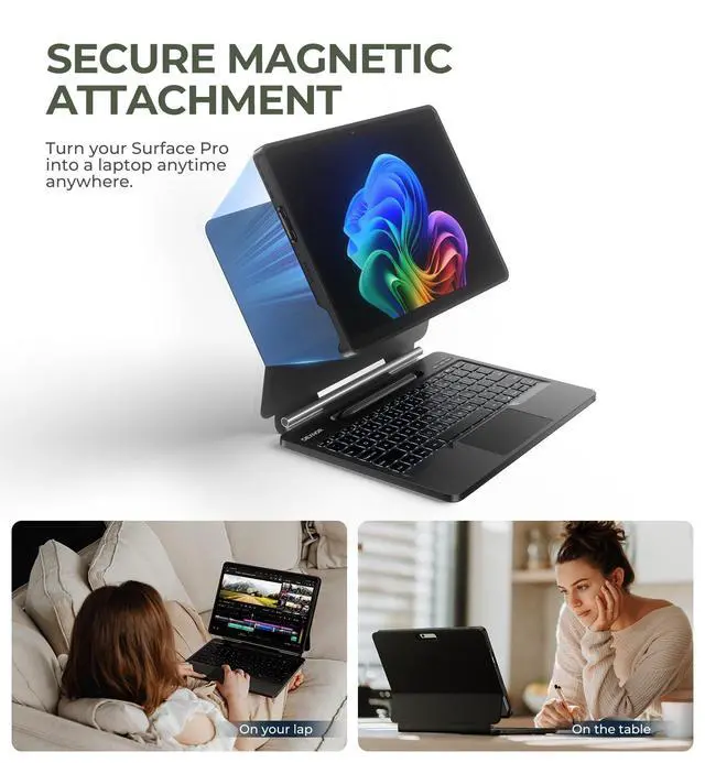 Read): Keyboard case weighs 2.43 lbs and Surface Pro tablet weighs 1.97 lbs. Combined weight is noticeable. If you prefer a lightweight setup, please consider carefully before purchase. ^^ [Easy-Set Magnetic Stand with Raised Screen View] - Instantly turn your Surface Pro into a laptop-like workstation with the durable aluminum alloy hinge. The magnetic floating cantilever stand supports multiple adjustable angles and a raised screen view, helping reduce neck strain during long sessions. Perfect companion for office, business, study and creative use. Ideal for handling emails, taking notes, video meetings, streaming and presentations etc. ^^ [Detachable Magnetic Protective Case] - Designed for Surface Pro users who switch between productivity and relaxation. The detachable magnetic case offers full protection with efficient heat dissipation, while letting you seamlessly move between laptop and tablet modes. The hollowed back fully supports the built-in kickstand for stable typing, sketching, or streaming. Strong built-in magnets even let you attach your Surface Pro to the fridgeperfect for hands-free recipe viewing while cooking. ^^ [High-precision Multi-touch Trackpad] - Revolutionize your tablet experience with our keyboard case featuring a precise and smart trackpad.