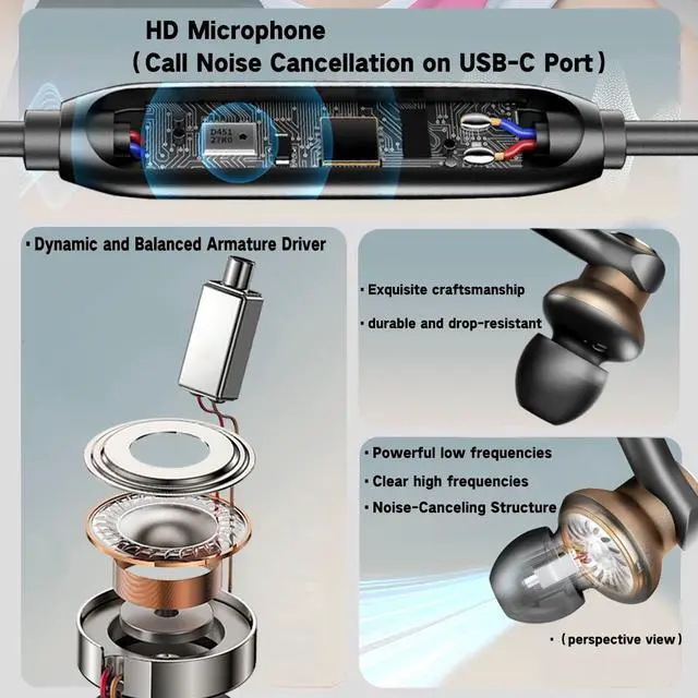 Experience superior sound quality with these advanced wired earbuds featuring dual dynamic coil technology. The innovative combination of iron and dynamic coils delivers powerful bass and crystal-clear vocals, while the built-in noise reduction structure helps minimize ambient sounds during calls and music playback. These earbuds come with a USB-C adapter that enables noise-canceling functionality, making them perfect for commuting or busy environments. The precise workmanship is evident in the elegant metallic finish and ergonomic design that ensures comfort during extended use. The powerful sound unit produces high-definition audio with impressive subwoofer performance, making every note come alive.