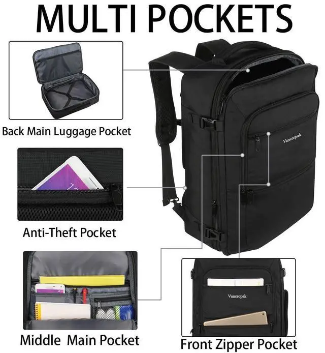 Organize: The luggage backpack's main compartment with separate mesh pocket and roomy space to store different travel gears, internal compression elastic straps can well secure items. The front compartment with various pockets can be used to store notebooks, pens, earphones, and other small items, for quick pick out. An anti-theft back pocket is suitable for valuables. The travel backpack is large enough for vacation, weekend getaway, overnight trip ^^ Reduce