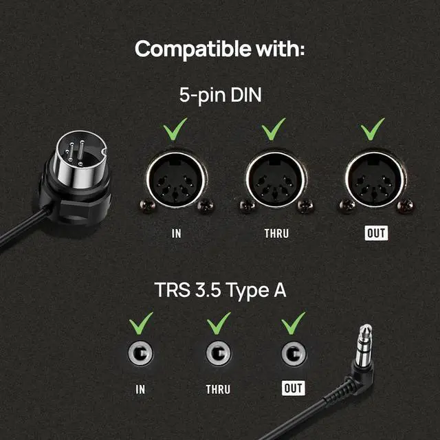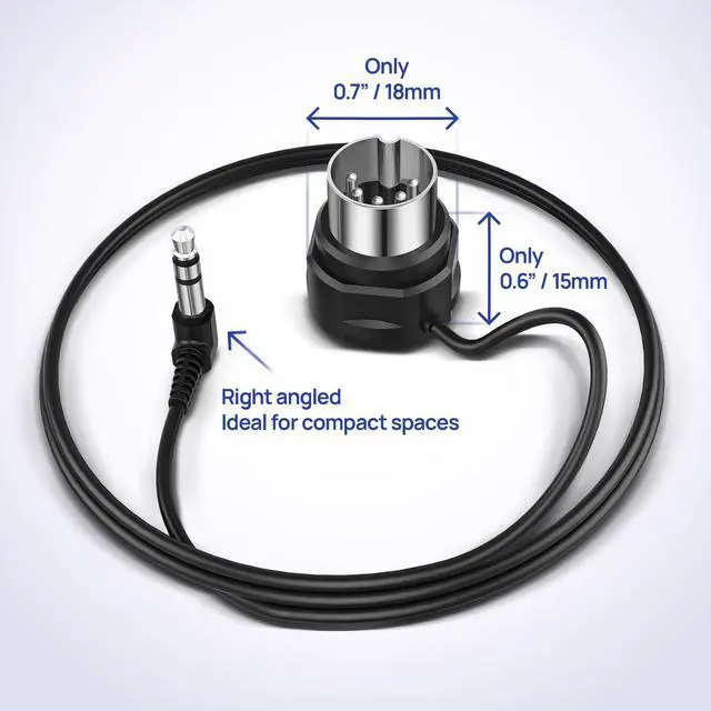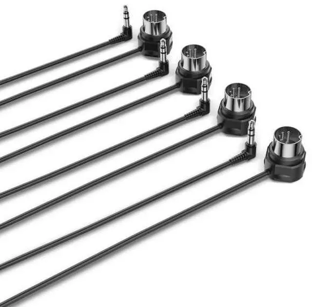 [Convenient Design] Enjoy high-speed MIDI data transmission without latency thanks to the ultra-thin, high-performance plug design. The right angled plugs fit seamlessly into tight spaces and is easy to connect with convenient protrusions ^^ [Universal Compatibility] Seamlessly connect your MIDI devices keyboards, synthesizers, controllers, guitar pedals using TRS 3.5 mm (1/8) Type A and 5-pin DIN MIDI In, Out & Thru ports, following the MIDI Association standard ^^ [Robust & Reliable] Nickel-plated connectors and oxygen-free copper core endure frequent plugging and unplugging. Integrated shielding prevents interference, ensuring error-free MIDI data transfer of all your MIDI messages ^^ [Community Inspired] Crafted with input from the Music Enthusiasts Community and backed by over 30 years of experience and MIDI Association board membership, this 4-pack ensures a premium MIDI experience ^^ [4-Pack - 2FT / 60CM] Get four 2FT / 60CM cables with TRS Type A ( 3.5 mm - 1/8) Male to 5-pin DIN Male connectors.