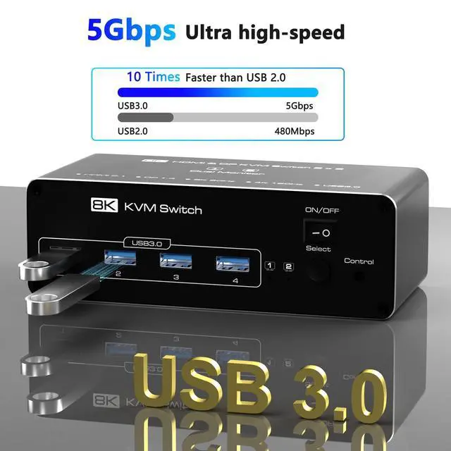 Note: Requires 4K/8K-compatible source, monitor, and cables, otherwise, flickering may occur. ^^ USB 3.0 KVM SwitcherThis HDMI KVM switch 2 port is equipped with 4 USB 3.0 ports that can reach a USB 3.0 Hub (5Gbps) with 4 PortsrShare keyboard, mouse, printers, and USB drives across both PCs. Backward compatible with USB 2.0 / 1.1 devices.