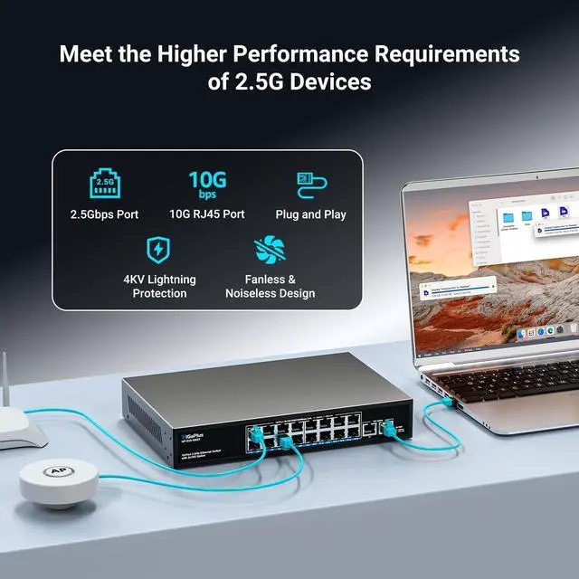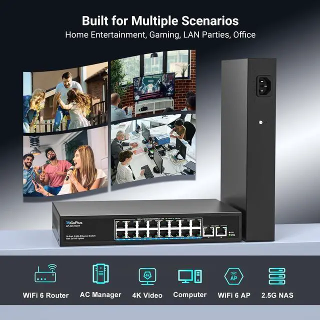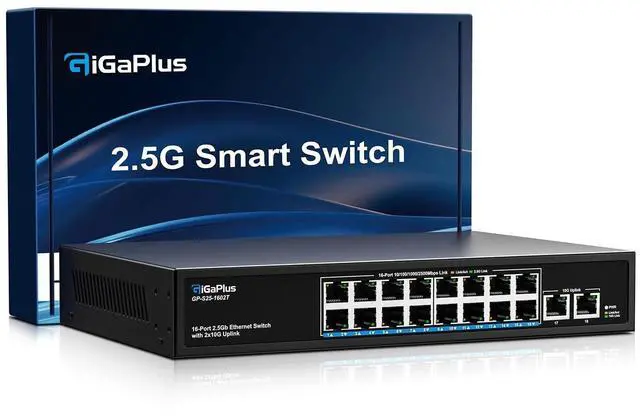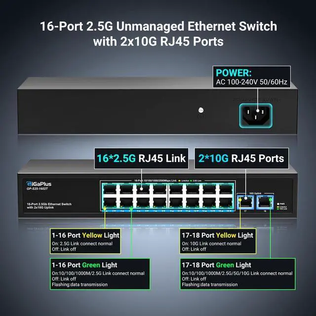 18 Ports 10Gb Unmanaged Ethernet Switch with 16* 2.5G Base-T Ports, 2*10G RJ45 Ports. 120Gbps Switching Capacity, GiGaPlus 10Gbps Network Switch for 2.5G /10Gbps NAS/PC, WiFi6 Router, Wireless AP