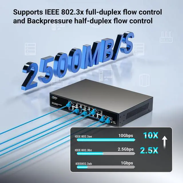 Plug and Play: Supports 10/100/1000M/2.5G auto-sensing on ports 1-16, with auto MDI/MDIX and non-blocking data forwarding support, easy to set up without any configuration or software, providing the best performance for all your devices. This switch provides 2x10G RJ45 ports for high-speed network connections, providing a cost-effective solution for adding 10G link capacity.