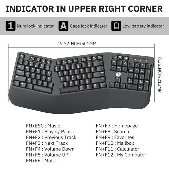 Plug and play, no software needed, convenient and efficient. ^^ Comfortable Wrist Rest Our ergonomic wireless keyboard with wrist rest and foldable stand design improves overall comfort and reduces pressure on hands and wrists. Helps your wrist to be in a comfortable position and better body posture. Perfect for those Office-men needing long time working, enhancing comfort during prolonged typing sessions. ^^ Plug and Play104 Keys Full Size Keyboard. Featuring standard keyboard layout with F-keys ( function keys ) and number pad. The wireless keyboard brings you efficient typing while at work.