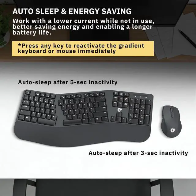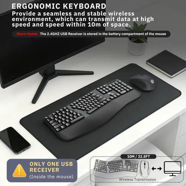 Ergonomic Design The scientific wave keys design allows easy finger access to all keys, ergonomic curved surface layout for natural typing posture, maximizing hand comfort for long hours of work. Scientific ergonomic design mouse for smoother movement and less overall strain, providing a comfortable using experience like never before. ^^ 2.4G hz Wireless ConnectionStable and reliable connection of wireless keyboard and mouse is up to 10m (33ft). This combo share a nano USB receiver, no need to take up additional USB ports (Also the wireless keyboard and mouse can also be used separately).