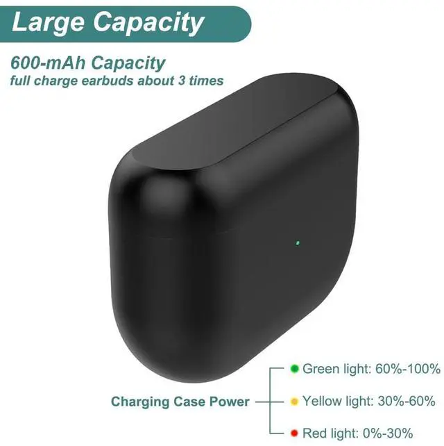 ^^ LED INDICATORS: The case features LED indicators that inform you of the charging status of your earbuds and the charging case itself. The earbud lights signal red when charging and green when fully charged. The charging case also features its own indicator, showing red while charging and green when fully charged. The external LED status will inform you of the battery percentage, with red flickering indicating 0 to 30%, yellow for 30 to 80%, and green for 80 to 100%.