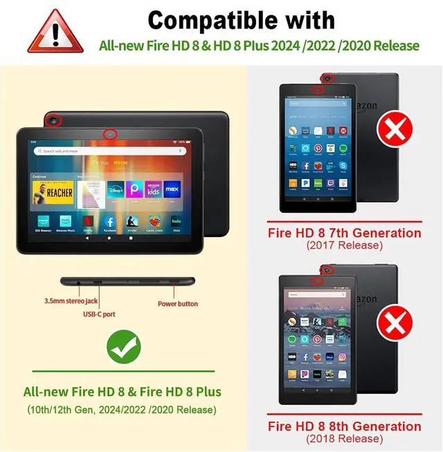 CompatibilitySpecifically designed for Kindle Fire HD 8 / Fire HD 8 Plus tablet (12th/10th Generation, 22024/2022/2020 Release);