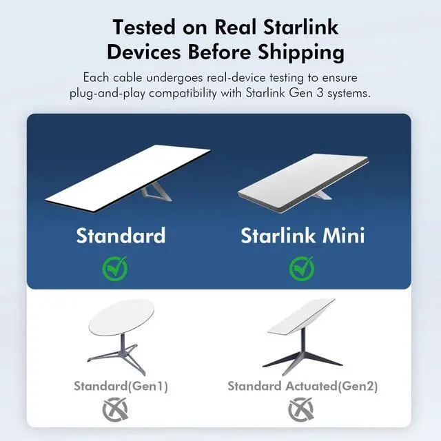 ^^ REAL- DEVICE TESTED: Starlink Standard Cable, Each Stalink Cable is fully tested using actual Starlink Gen 3 equipment before shipping. Compatibility is guaranteed. After connecting, allow 3060 seconds for your Starlink system to detect the cable. ^^