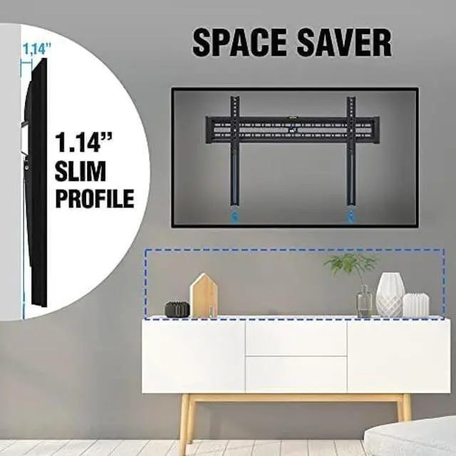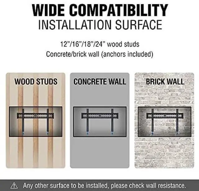 FIXED TV WALL MOUNT DESIGNED FOR OVERSIZED TVs: This fixed TV wall mount is designed from 32" up to 86" TVs and is rated for TVs up to 110lbs/50kg. It has a compatible faceplate that fits VESA size from 3.9 x 3.9 in to 23.62 x 15.74 in (HxV). ^^ CERTIFIED FOR COMPLETE SAFETY, BUILT TO LAST! This product is made of solid carbon steel and works perfectly for safety mounting on 12", 16, 18, 24 wood studs, concrete, and brick walls. Preferably do not install it on the drywall alone, unless there is a reinforced structure inside, especially for TV mounts. ^^