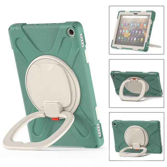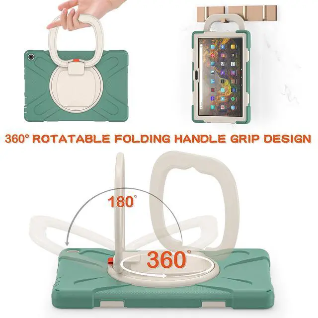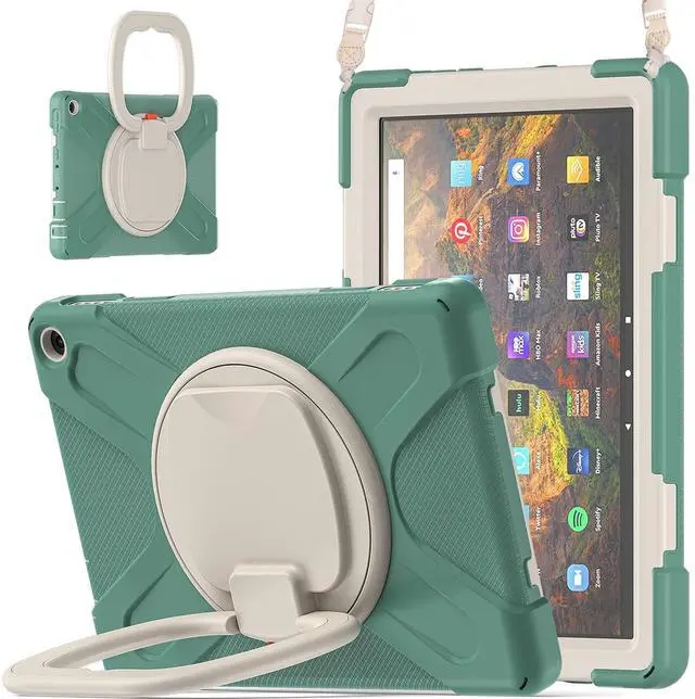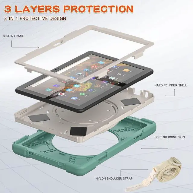 Compatible Models: New Fire HD 10 & 10 Plus 2021 Tablet11th generation, 2021 Release). NOT fit Fire HD105th/7th/9th2015/2017/2019 Release). ^^ Multi function New design in 2021, The 360 degree rotating bracket provides multi angle viewing, providing you with a very convenient and amazing use experience. After the bracket is opened, it can be grasped and carried as a comfortable handle. You can also easily hang your tablet on the wall or anywhere you like ^^ Removable & Adjustable Shoulder Strap Portable shoulder strap, etachable, adjustable length, It is very convenient for you to carry your tablet at work, travel or outdoors, It is also very suitable for children. You can also hang it behind the headrest of the car seat. ^^ Anti-shock The three-layer structure design combining PC and silica gel is shock-resistant, so you dont have to worry about your tablet slipping off your hands and breaking it. All ports, buttons, and cameras can be accessed without removing the case.