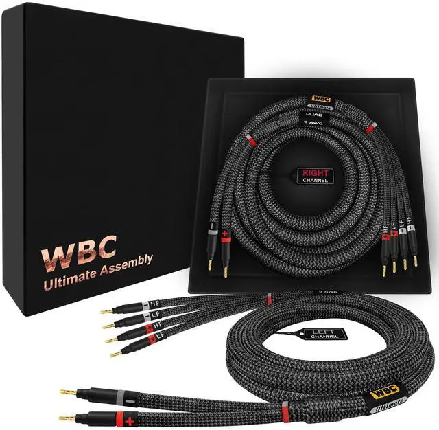 The high-end packaging, makes these a great gift for any Audiophile or Music Lover who will appreciate handcrafted, high quality audio cabling. The braided Tweed cloth jacket and embroidered labeling will compliment your high-end gear quite tastefully; this is truly The Ultimate speaker cable. ^^ At WBC we only use the highest-grade connectors for these audiophile cable assemblies. Eminence 3 micron, 24K Gold plated, audiophile-grade, 4mm (standard diameter) banana plugs with a fully insulated body to prevent accidental shorting, provide superior abrasion & corrosion resistance and unrivalled performance. The banana plugs are specially reinforced to support heavy gauge cables (special shaft inside).