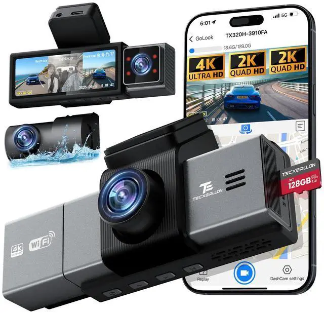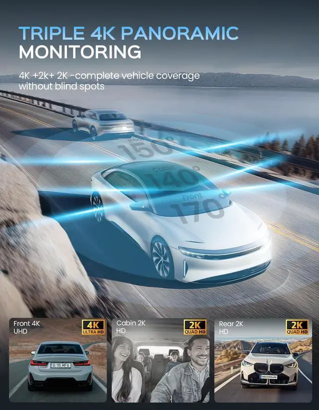 Dash Cam: The front dash cam captures stunning 38402160P footage, while the interior and rear cameras deliver crisp 25601440P resolutionensuring comprehensive coverage of the road, cabin, and everything behind you. Featuring a 170 ultra-wide front lens, 150 rear lens, and 140 interior lens, it minimizes blind spots and captures critical details across multiple lanes and inside the vehicle. ^^ 128GB SD Card for