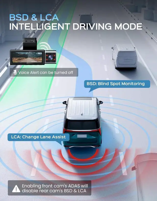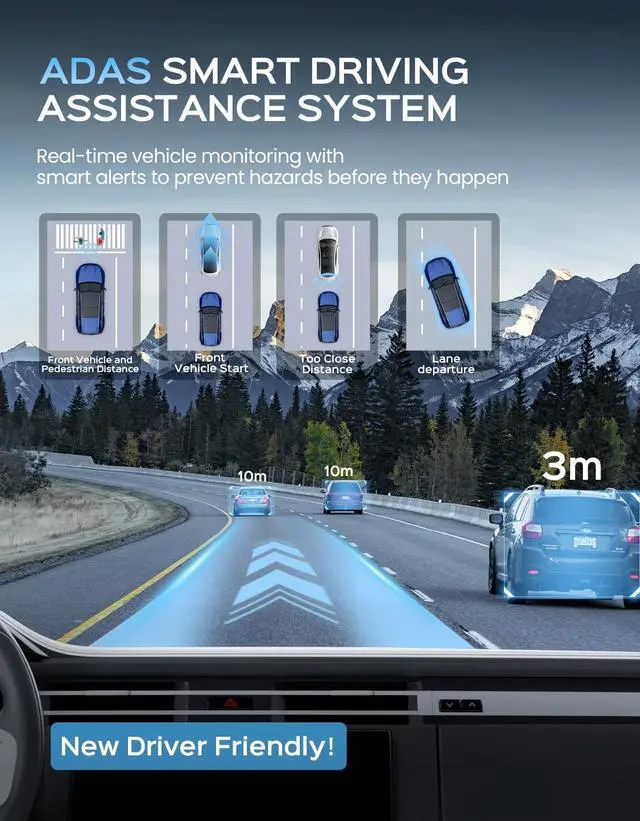 Loop Recording: Pre-installed with a 128GB SD card, the dash camera is ready to record right out of the box. Loop recording ensures continuous coverage by overwriting the oldest footage, while the built-in G-Sensor automatically detects sudden braking, collisions, or impactsinstantly locking and protecting video clips from being overwritten. This safeguards critical evidence when you need it most. ^^ ADAS Smart Driving Assistance for
