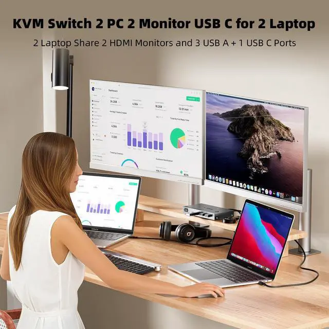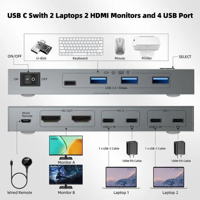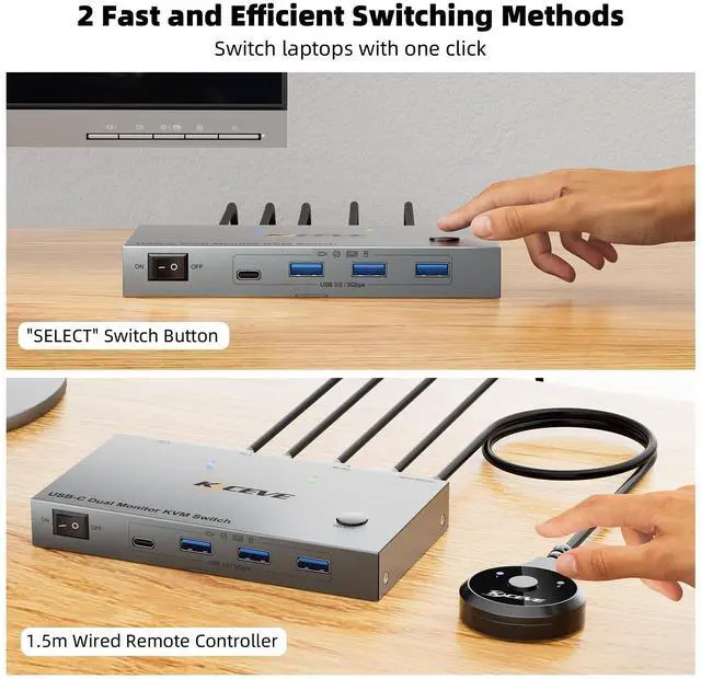KCEVE USB C KVM Switch 2 Monitors for 2 LaptopsSimplify your setup with the USB C KVM switch 2 computers. This KVM switch 2 monitors for 2 laptops allows you to control two USB-C laptops with one keyboard, mouse, and 2 HDMI monitors, while sharing printers and scanners. Instantly switch between extended or mirrored modes using "Windows+P". The KVM switch 2 monitor 2 laptops design declutters your desk and boosts productivity ^^ KVM Switch USB C with