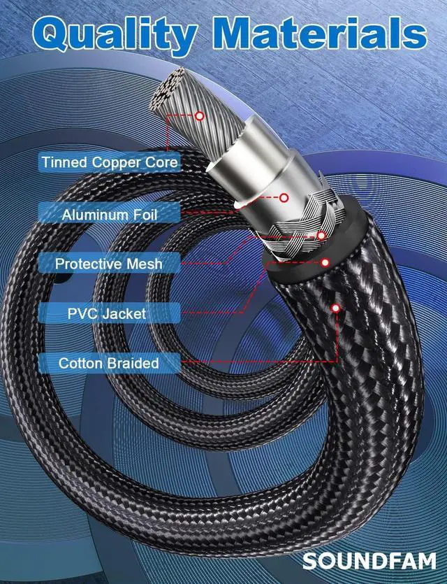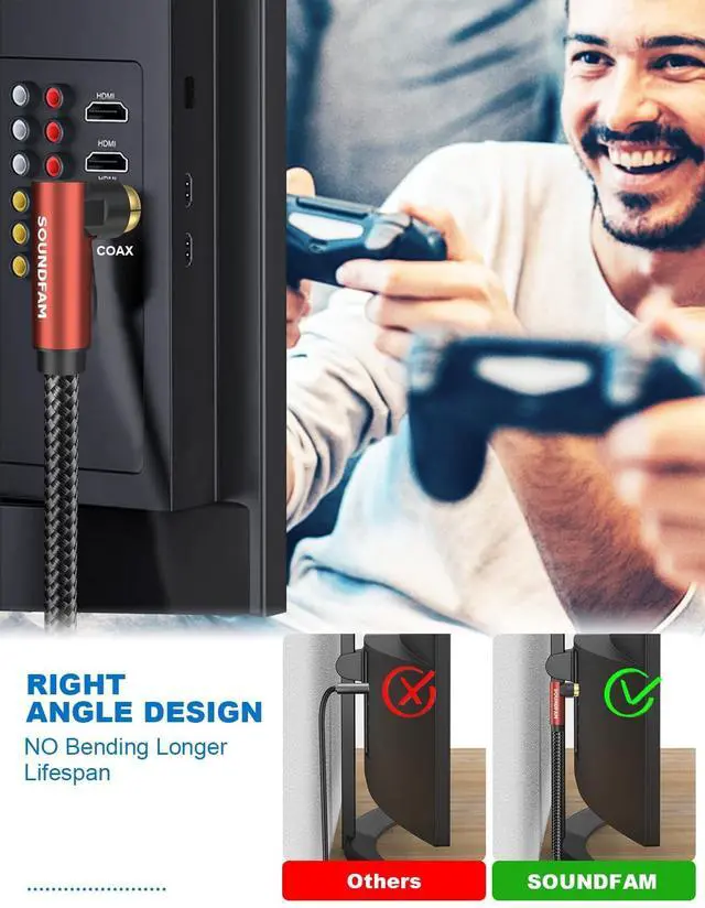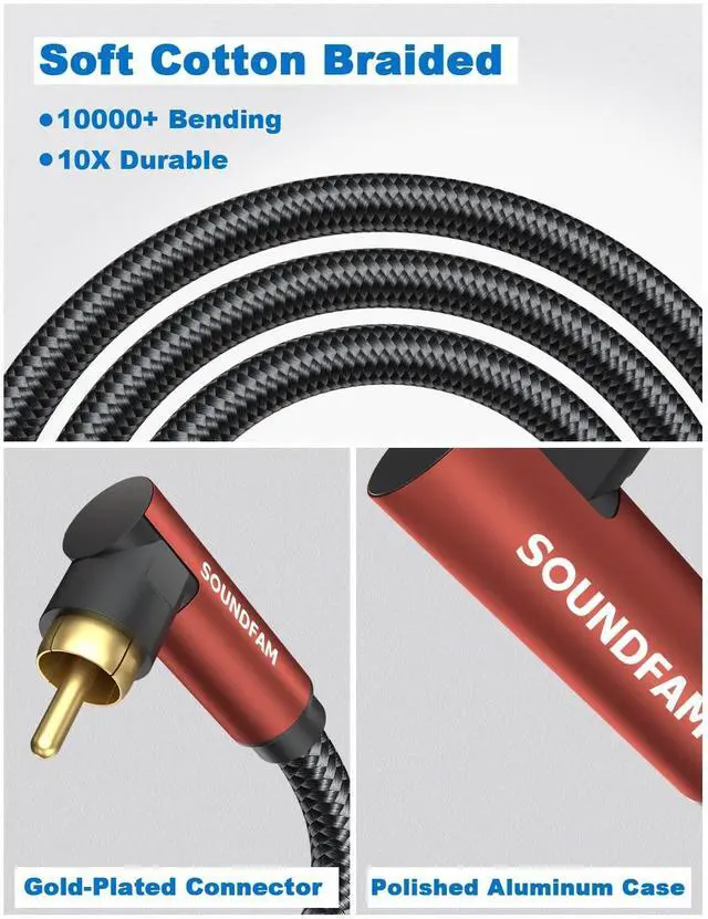 90 Degree RCA Cable-- If you are experiencing problems with equipment in tight spaces and difficult to connect, the SOUNDFAM 90 degree RCA cable can help you solve your troubles. This RCA subwoofer cable is designed to save space, and the 90 degree connector prevents the cable from bending and lasts longer. ^^ Superior Sound Quality-- This 90 degree subwoofer cable features corrosion-resistant RCA gold-plated connectors and a polished alloy housing that provides optimal conductivity and pure, clear stereo audio. Double shielded subwoofer cable, consisting of copper braided and aluminum foil, provides maximum signal power with minimum signal loss and protection against Radio Frequency Interference (RFI) and Electromagnetic Interference (EMI).