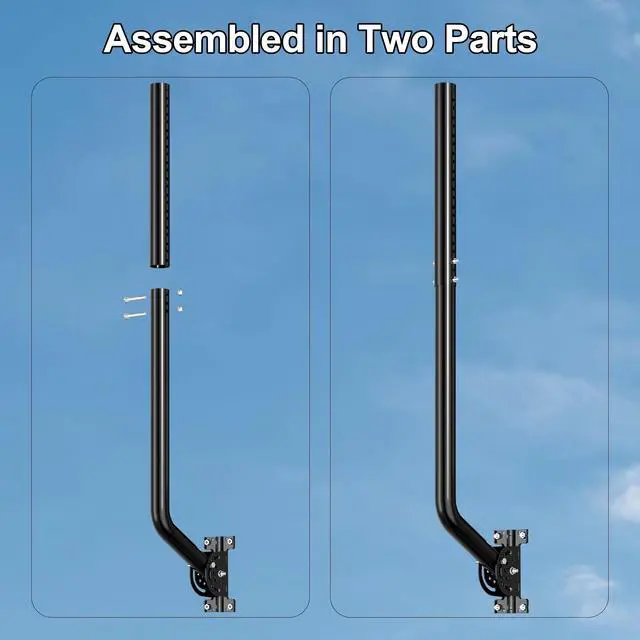 Glance: Heavy-duty J-pole with 36" mast ( 1.38" diameter) Modular height system with optional 12" extensions Supports devices up to 50+ lbs Triple-screw locking design for superior stability Compatible with Starlink, antennas, routers, and more Complete installation hardware included Powder-coated iron for all-weather durability Ideal for wall, roof, and eave installations Full angle and direction adjustability Perfect for
