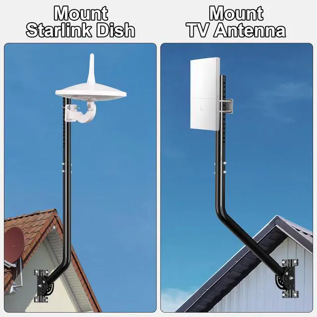 Customize your installation height to optimize line-of-sight for better receptionwhether youre in a rural area aiming for distant signals or mounting above nearby obstructions. Compatible with a Wide Range of DevicesThis universal J-mount isnt limited to TV antennas. It supports a broad spectrum of outdoor electronics, including: Starlink Gen 2 / Gen 3 / Mini DishesOutdoor TV AntennasWireless Ethernet BridgesWiFi Routers and ExtendersWeather Monitoring StationsMeteorological EquipmentWind VanesOutdoor Access Points and IoT DevicesWhether you're a weekend camper, RV traveler, remote worker, or rural homeownerthis mount adapts to your signal needs. Complete Mounting Hardware IncludedEverything you need is right in the box: Expansion bolts for brick or concrete wallsScrews for wood wall installationUniversal brackets and pivot arm for multiple surfacesHeavy-duty mounting base with pre-drilled holesWith this all-inclusive kit, installation is straightforward and tool-friendly, even for DIY users. Just mount it, secure it, and connect your deviceno extra hardware required. Premium Weather-Resistant ConstructionMade from high-grade iron and finished with a protective black metal paint coating, this antenna mount is built to endure the toughest environments. From blazing sun to heavy rain or snow, the anti-corrosion design resists rust, fading, and wearensuring your installation stays strong and secure all year round. Flexible Mounting Options for Any SurfaceDesigned for wall, eave, and roof installations, the adjustable base and pivoting bracket allow for mounting at various angles and heights.