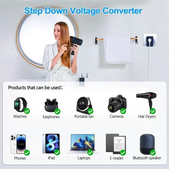 Converter designed for hair dryers: This power converter efficiently steps down voltage from 220/240V to 100/120V, making it ideal for electrical products ranging from 35W to 800W, Compatible with electrical tools(25W-800W) such as hair dryers, phones, cameras, watches, laptops, earphones(Note: Our voltage converter is not applicable to the following products regardless of the power used: hair Curlers, hair Straighteners, electric toothbrushes, blender, electric Shavers, electric Irons. ) ^^ Smart Type-C Charging & 5 in 1: This travel converter saves space in your luggage and comes with a convenient lanyard and organizer bag, making it a travel essential. With the ability to charge up to 5 devices at oncefeaturing 2 USB-C ports and 2 USB-A portit eliminates the need for multiple chargers, keeping your devices powered on the go. Boasting a sleek, lightweight design50% lighter than other converters, making it the perfect travel companion. ^^