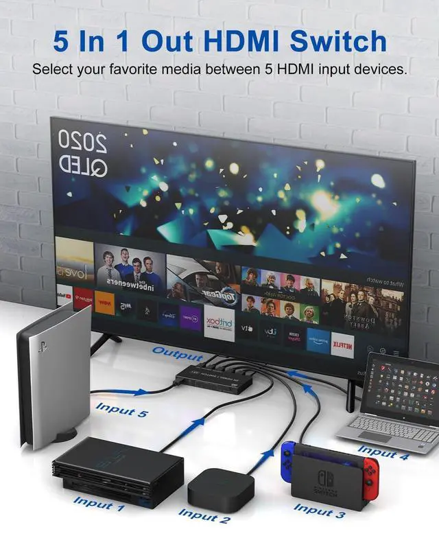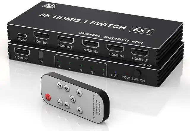 HDMI Switch Seamless Device Integration: Easily connect up to 5 HDMI source devices to a single HDMI display with this 5-in-1 HDMI switch. No more hassle of constantly swapping cablesjust plug and play. Five LED indicators clearly show which port is active, making it ideal for home entertainment setups, office use, conference rooms, and more. ^^ Supports 8K@60Hz & 4K@120Hz