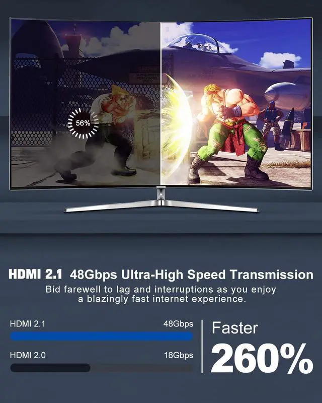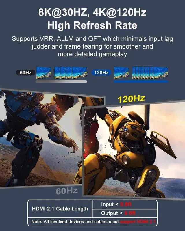Next-Level Visuals: Harness the power of HDMI 2.1 with support for ultra-high resolutions up to 8K@60Hz and backward compatibility with 4K@120Hz, 4K@30Hz, 2K@120Hz, and 1080P@240Hz. Enjoy immersive viewing with HDR10, VRR, and 3D capabilitiesperfect for high-performance gaming and cinematic experiences.