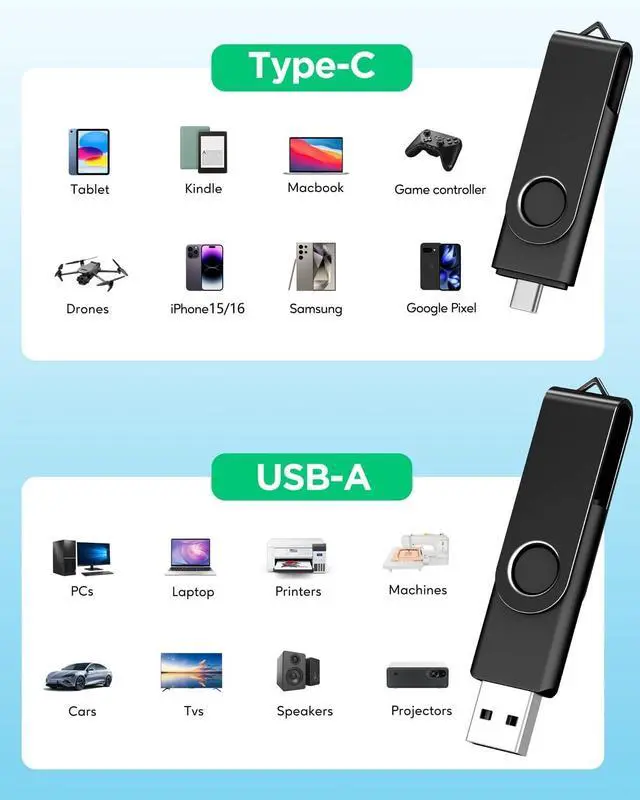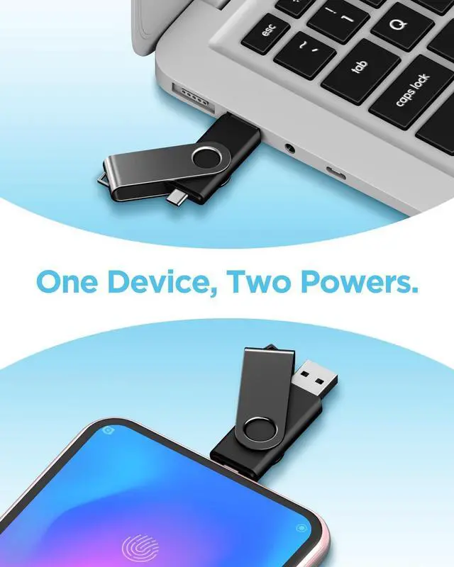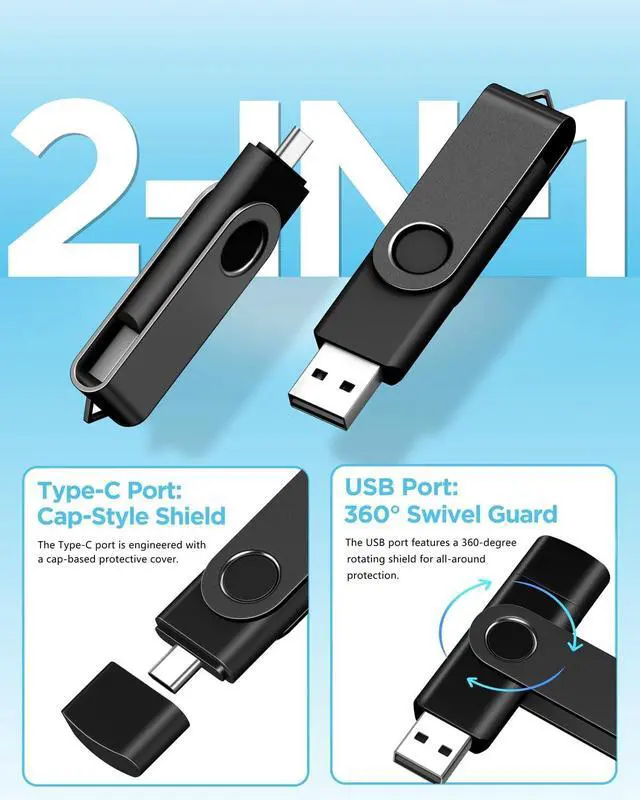 Dual-Port Design: the 4 USB flash drive has USB-A on one end, USB-C on the other. A 360 rotating metal shield lets you flip instantly between connectors, while the built-in bottom cap keeps the unused port safe from dust and damage ^^