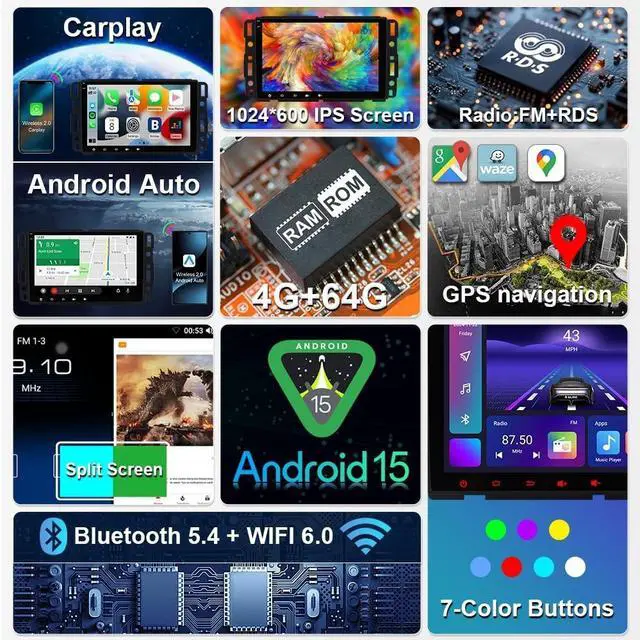 memory: Enjoy faster, smoother driving with the latest Android 15 head unit. Powered by a quad-core CPU, 4GB RAM, and 64GB ROM, it delivers quick app launches, seamless multitasking, and ample storage for maps, music, and mediaideal for modern drivers seeking speed and efficiency. ^^ Unlimited wireless speed- wifi 6.0 & bluetooth 5.4 with 2.4GH z/5GHz dual band: Enjoy blazing-fast downloads, lag-free streaming, and ultra-stable connectivity with Wi-Fi 6.0 dual-band support ( 2.4GH z/5GHz). Instantly pair your smartphone with Bluetooth 5.4 for crystal-clear hands-free calls and immersive music playback. Built for drivers who demand high-speed, high-fidelity, and always-on wireless performance ^^ Effortless Installation with