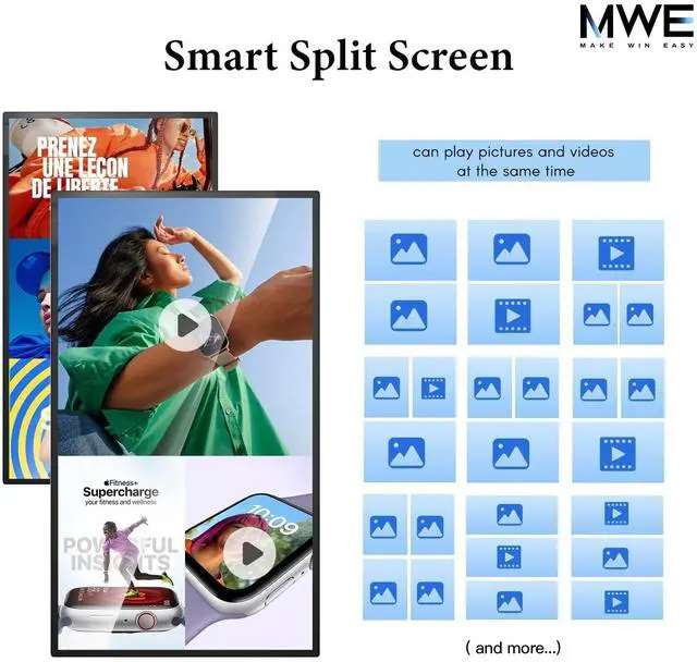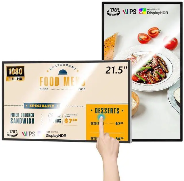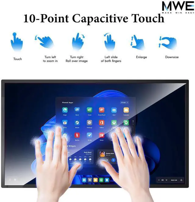 21.5 -inch LCD Touchscreen Monitor FHDMWE Digital Signage has 1920*1080 FHD screen resolution, 10-point capacitive touch (PCAP), 350nits brightness and 1200:1 high contrast ratio, presenting a clear, vivid picture with accurate reproduction of both colors and details to meet the visual needs of various scenarios ^^ Powerful system performanceMWE Wall Mount Digital Signage is equipped with Android system, 4+32GB storage combination, running smoothly, and you can freely download all kinds of applications. It also supports wired connection to Windows system ^^ Multi-functional SupportThis Touchscreen Monitor made by MWE supports U disk plug-and-play and copy playback, convenient and fast file sharing; supports HDMI input source display, easy to connect to a variety of devices; also supports the installation of our CMS real-time information distribution system control, to meet the needs of diversified information display ^^ Commercial DesignSupport 7*24 hours of commercial use, durable, stable and reliable, MWE Commercial Display is the ideal choice for commercial display, public area information dissemination and other scenarios; at the same time, support timer on/off settings, energy saving and worry-free ^^ Convenient InstallationMWE Digital Signage supports wall-mounted, standing, hanging, embedded and other installation methods.