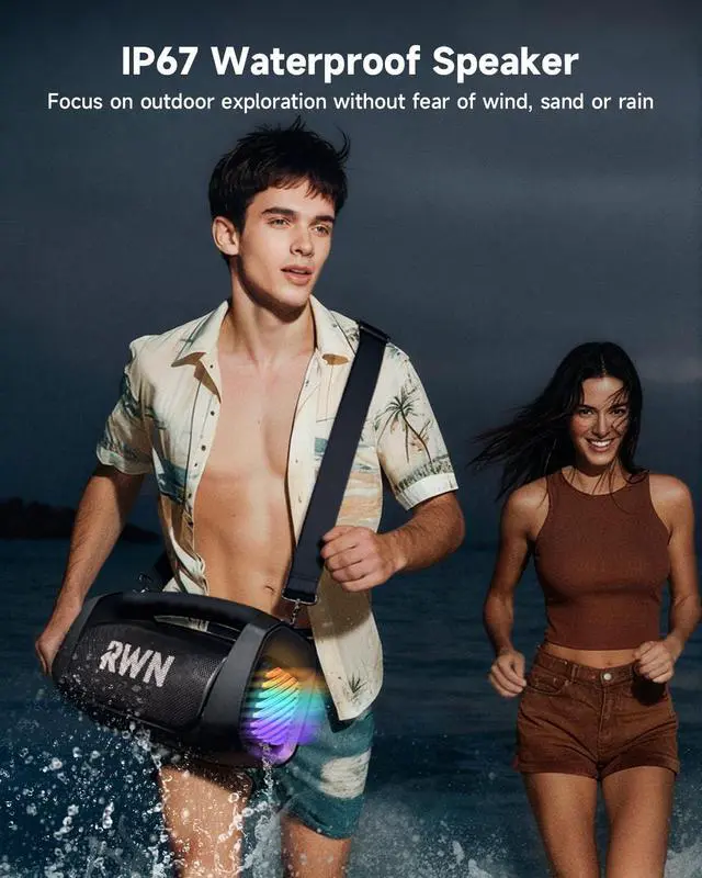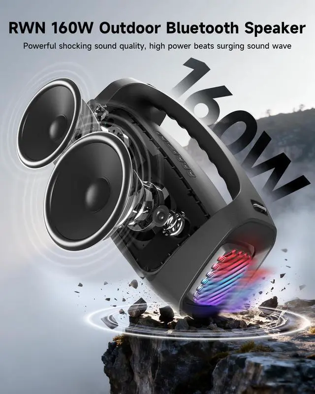 OUTDOOR SOUND: This portable speaker is equipped with two 3.5 -inch 60W woofers and two 20W tweeters. DSP Intelligent Crossover technology adds depth and clarity to the sound. With up to 160 W, it's easy to navigate backyard parties and movie Night. ^^ IP67 FULL PROTECTIONBuilt for outdoor adventures, this waterproof speaker shrugs off pool splashes, pumps your favorite tunes through hike rainshowers, and stays with you always.
