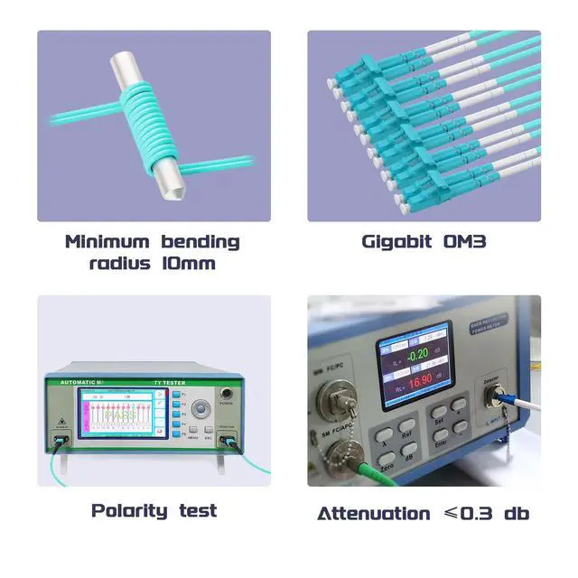 With a broadband of 4700MHz. km, OM4 multimode fiber achieves 10Gbps within 500 meters. It offers faster and more precise transmission compared to OM3. ^^ OM4 fiber patch cords can operate within a temperature range of -20C to +122C. Due to their flexible PVC coating, they are more suitable for indoor use. For outdoor and longer lengths, armored cables are recommended for better strength. ^^ Suitable for high-performance applications such as large-scale data centers, cloud computing, etc. This includes fiber optic communication systems, fiber-to-the-home deployments, optical data transmission, CATV networks, LAN setups, optical testing equipment, and fiber optic sensors.