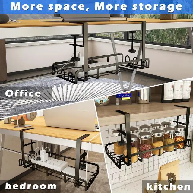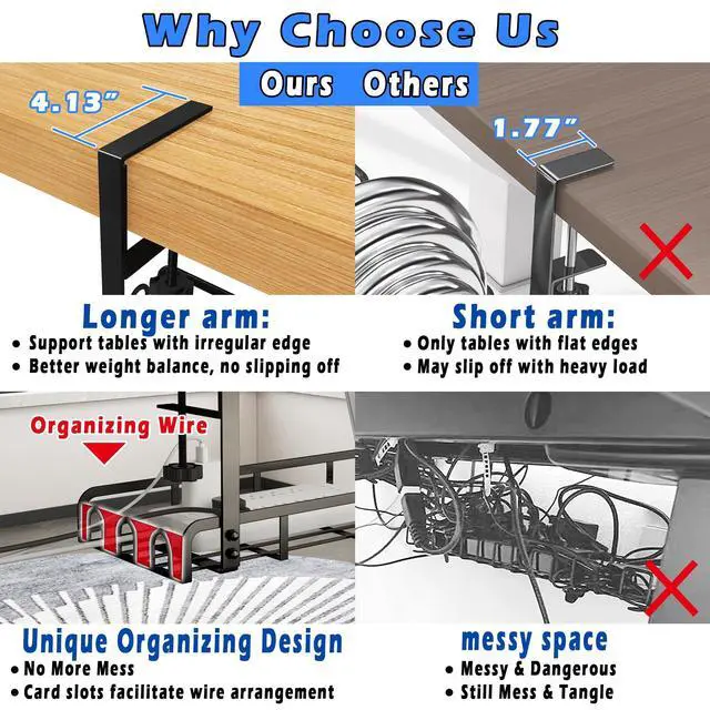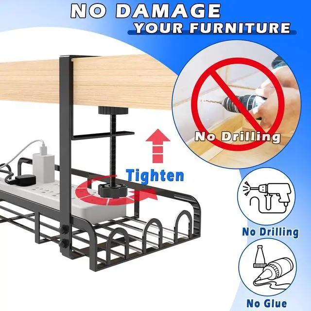 No Drill, Easy to InstallOur Under Desk Cable Management Tray is designed to clamp directly to desk frames, you can simply rotate the black knob by hand to clamp the cable rack tightly to your desk. Soft anti-scratch pads on clamps protect your desk from scratches ^^ Multi-purposeThe upgraded clamps with longer arms- 4.13" ( 10.5 cm) long, allows the Cable Management Under Desk to be installed on most desks with a thickness between 0.4" - 2.08" (1~ 5.3 cm). While others can only fit table with flat edges, this desk cord organizer can even fit desks with irregular shapes ^^ Unique-designed Management Versatile and minimalist design to keep cable clusters out of sight.