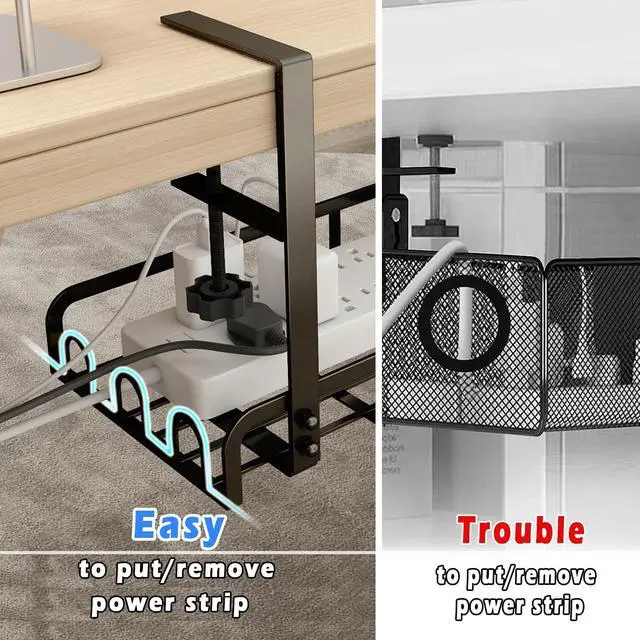 Cable pass-through for easy organize or access to your cables and power cords. There are card slots on both sides of the design, convenient sorting and storage wires ^^ Package IncludedThe wire management under desk kit contains most your need to organize wires: 2 Desk Wire Management Cable Tray, 2 adhesive cable clips for charger cables and stopping them falling back under the desks, 5 cable ties to wrap all loose wires and cables, 1 set installation tools ^^ Quality-assuredMade of powder-coated carbon steel for long life, this new wire hiders which is quiet stable, Square flat steel design Cord Organizer for Desk can easily hold power strip and more easy to organize cable wires