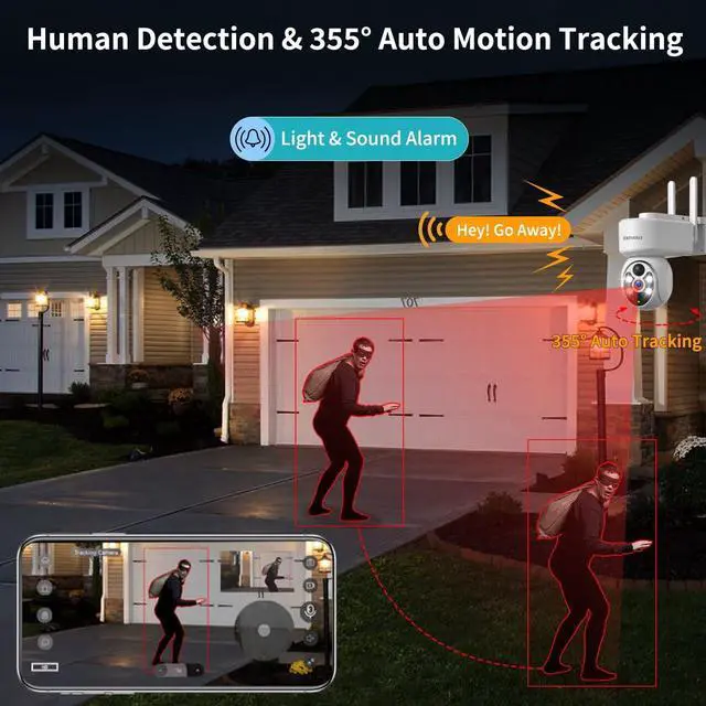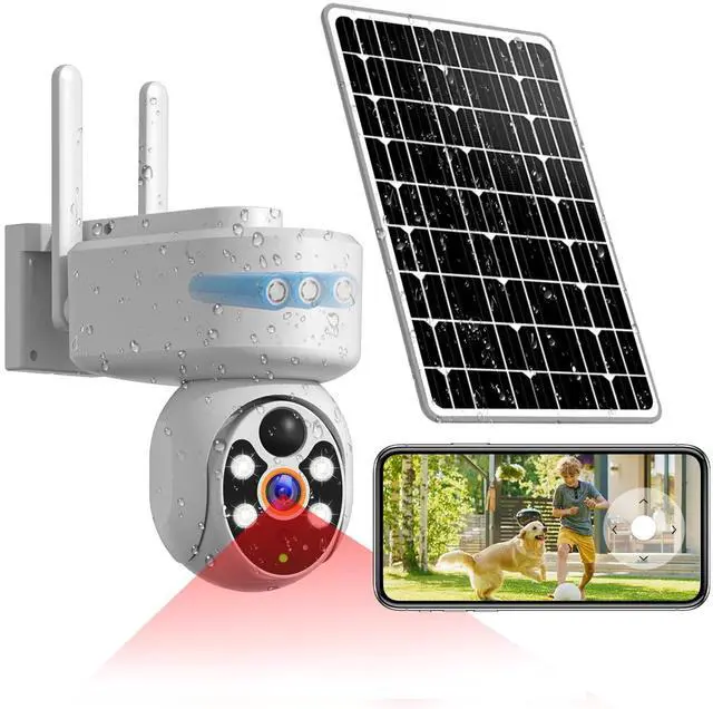 NOTE: The camera can only track one target in the picture. Most solar cameras don't have automatically track. We have enabled this feature for testing and will continue to improve it. ^^ 2K HD & 355 Coverage & Colorful Night VisionThis solar outdoor camera offer 2K high resolution image. Video is smooth, no bur, clear and crystal. You could see the demo videos. The spotlight could set to motion triggle, colorful at night. 355horizontal rotation & 100vertical rotation & 3X digital zoom. Rotate the camera to any angle you want, all could be done on your phone. With 110 wide-angle, the ptz camera guarantees a panoramic vision of every corner of your front door, yard, shop, garage. ^^ Smart Sharing & Privacy ProtectionSolar Outdoor Security Camera supports multi-user connectivity and device sharing with 32-128GB micro SD card (not included) and cloud storage, Out and about or busy at work, you may ignore the notification, but family members can scan your code to access the camera and protect your home together, while we focus on customer security and privacy protection, all images are encrypted, and no one can access the information without your consent.