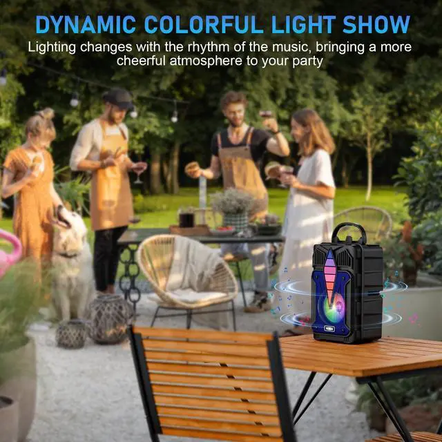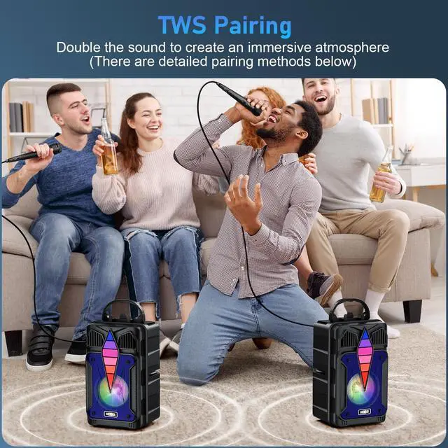 TWS ModeConnect two identical speaker via Bluetooth to form a dual speaker system with powerful stereo synchronization, allowing you to feel surrounded by two channels. Produce better stereo effects and more amazing sound effects, allowing you to better experience the beauty of music. ^^ Colorful Light ModeThis speaker comes with voice-activated RGB multi-color rhythm light, allowing you to switch between different coloured lights at will. Enjoy the joy of the party with colorful lighting and wonderful music, moving with the beat of the song, charming and romantic, allowing you to immerse yourself in the colorful music light show, perfect for family gatherings, Christmas performances, and various outdoor or indoor party activities.