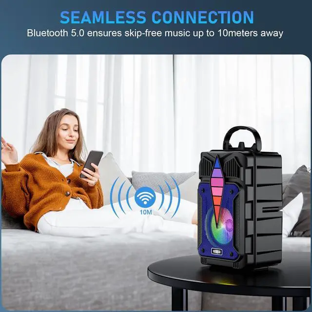Keep in mind that the actual playtime can vary depending on volume level, audio content, and usage. ^^ 3D HD Stereo SoundEnjoy the amazing music scene in 360 degrees and experience unparalleled sound quality. 360 surround highdefinition sound, the speaker delivers immersive sound with rich bass, without any noticeable distortion even at maximum yolume. Create an immersive stereo experience and fill any room with powerful sound. ^^ Multi-function SpeakerBuilt-in the latest Bluetooth 5.0 chip, providing more stable and long-distance transmission, ensuring uninterrupted party. This adult and children's machine also supports Micro TF card, Flash USB and AUX connection, and is compatible with Android phones, iPhones, iPads, TVs and PCs.