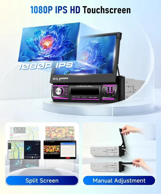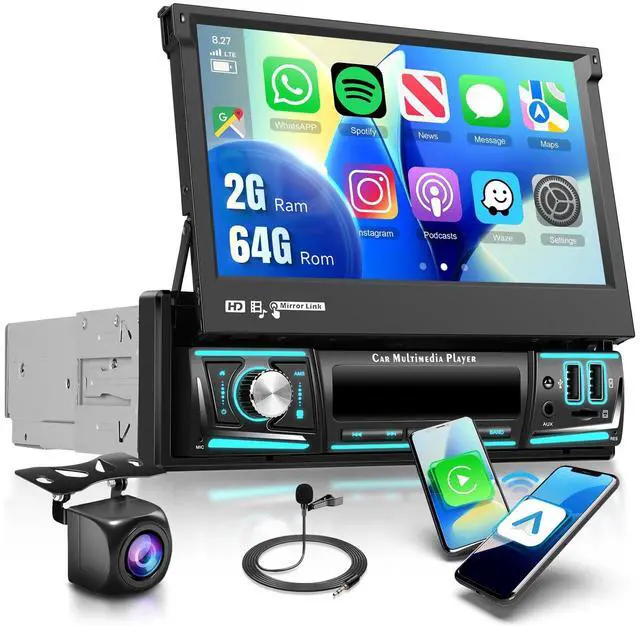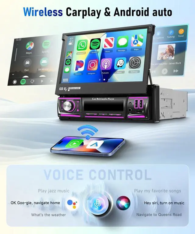 Single Din Head Unit: Coloful Lights/Interface Single din radio supports wireless carplay and android auto. 7inch Manual Flip-out head unit features 2USB interfaces for input or fast charging. 7 colorful lights for you to choose.