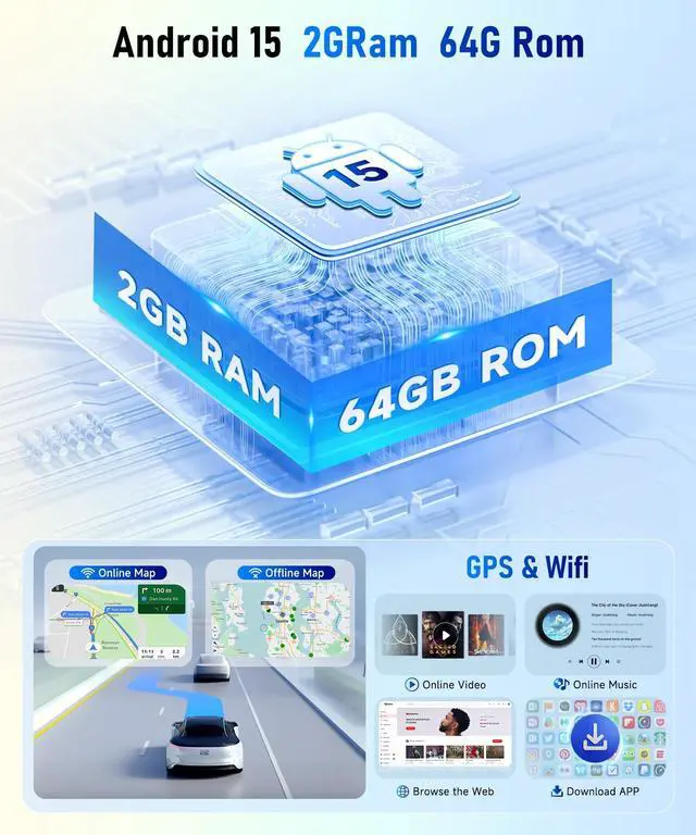 Android 15 Car Stereo with 2G+64G This Single din radio Featuring the Android 15 system, an 2GB RAM, and 64GB ROM for smooth performance. After connected wifi to downloas Apps. in app store, you can enjoy a variety of mobile apps like Waze, Spotify, YouTube Music, News, etc.