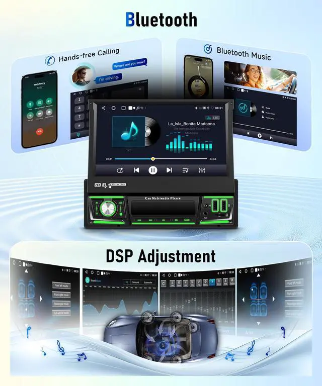 This bluetooth car stereo supports music playback, hands-free calls, and phonebook access. RDS/FM Radios allows you to listen to radio stations, providing various music, news, etc. DSP audio deliver various music effects: Vbass, Balance, Emperor, Filter, Loudness, etc ^^