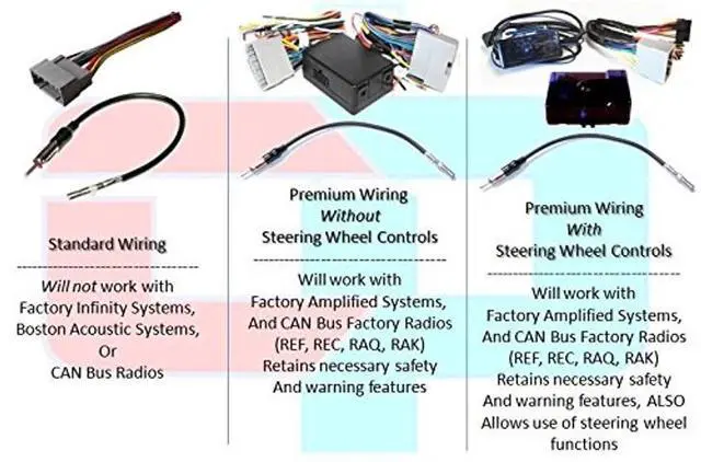 #1. Standard Wire Harness This wire harness is compatible with standard wiring only. Will not work on models with Factory Infinity Systems, Boston Acoustic Systems or CAN Bus Radios (models REF, REC, RAQ or RAK; The radio's name can be found on the face of the radio). #2. Premium Wire Harness Module This wiring harness allows models with Factory Amplified Systems or CAN Bus Factory Radios REF, REC, RAQ and RAK (names can be found of front of radio) to replace Factory Radios while retaining all necessary safety and warning features #3.