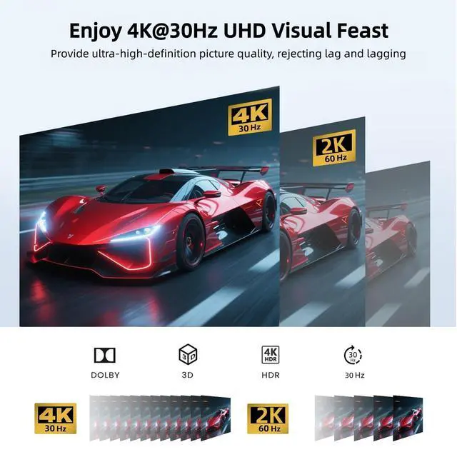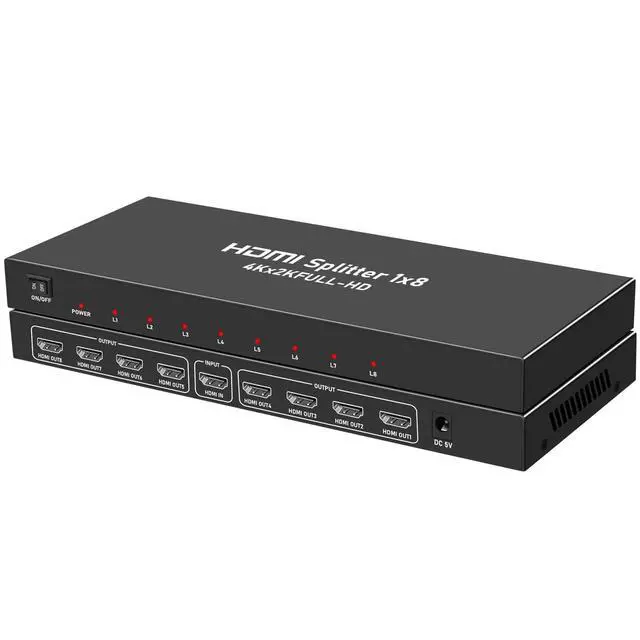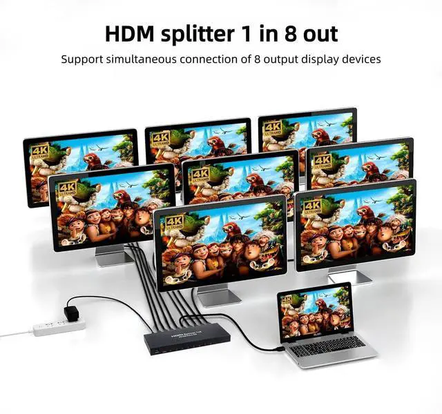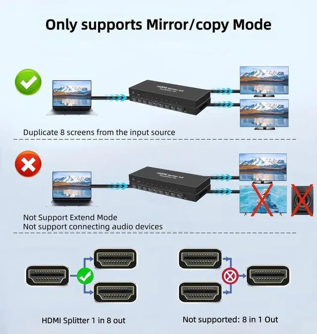 HDMI Splitter 1 In 8 OutHDMI Splitter enables you to distribute a single source, such as a computer, DVD player, or Game Box, across 8 monitors or HDTVs simultaneously. Please note that the output is mirrored (same display on all screens) and does not support screen extend. ^^ 4K@30Hz High ResolutionSupports resolutions up to 4K@30Hz, as well as 1080p, Full 3D, and 12-bit Deep Full HD. It also provides advanced audio support, including LPCM, Dolby TrueHD, Dolby DTS Plus, and DTS-HD audio, ensuring high-quality video and immersive sound for a premium viewing experience.