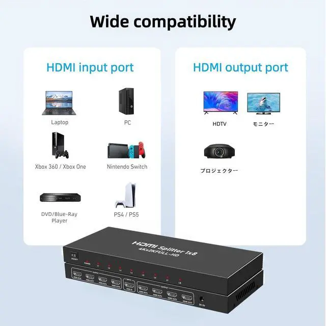 ^^ Wide CompatibilityThis 8-port HDMI splitter is fully HDCP compliant and supports HDMI 1.4 b output. It is compatible with a wide range of input devices, including computers, PS3, PS4, B0X, Blu-ray DVD players, and set-top boxes. On the output side, it supports projectors, HDTV, monitors, and more, ensuring seamless connectivity across various devices.