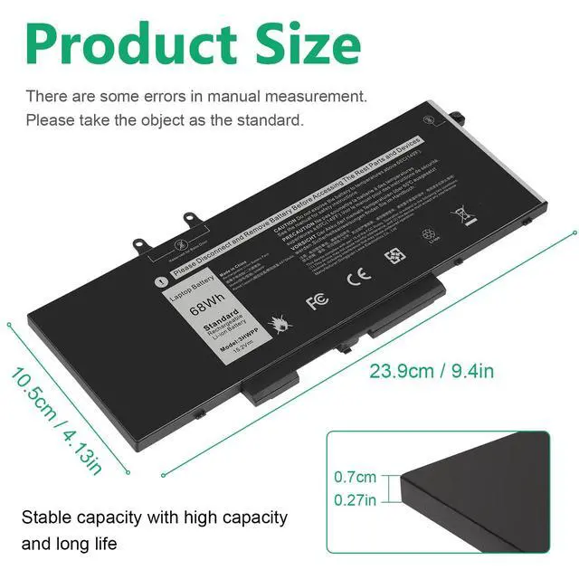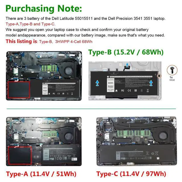 Cell: 4Cells; 100% brand new from manufacture. Grade A cells ensure fast charges and low power consumption. ^^ Compatible Part Number3HWPP 03HWPP 10X1J N2NLL 1VY7F 01VY7F 451-BCMN. ^^ Compatible Laptop ModelsFor Dell Latitude 5401 E5401 5411 E5411 5501 E5501 5511 E5511 Series, For Dell Latitude 14 5410 SeriesFor Dell Latitude 15 5510 Series, For Dell Precision 3541 3551 Series. ^^ Compatible Laptop ModelsFor Dell inspiron 17 7500/7506 2-in-1 Black Edition Series (NOT fit for Dell inspiron 17 7500/7506 2-in-1 Silver Edition).