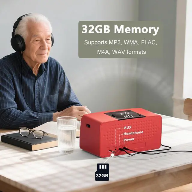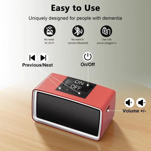 ^^ Easy to operate Playback switches with bold, high-contrast labels, the buttons are easy to spot and press. The volume knob is conveniently placed on the side, designed for quick, intuitive adjustment with just a twist. This audio player layout ensures visual impairment seniors can operate the player independently, with no confusing menus or technical hurdles to overcome. ^^ Convenient Memory Function Whether you pause or turn off, as long as you don't unplug the power, the simple music player for elderly will remember your last playback location. When you turn it on again, it resumes right where you left off, so elderly users or those with dementia wont struggle to find their place in a song.