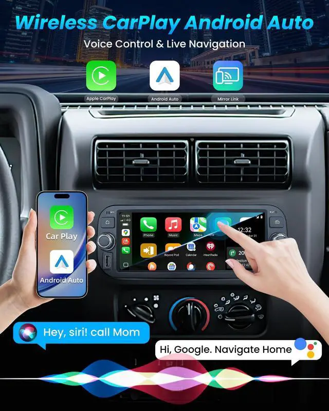 Applicable Models: This Android car radio is suitable for Dodge RAM 2002 2003 2004 2005 2006, for Jeep Wrangler 2003 2004 2005 2006, for Jeep Grand Cherokee 1999-2004 and so on. Android 12 operation system 4Core 2GRAM 64GB ROM with enhanced fluency, you can better control this machine. ^^ AHD Backup Camera & SWCRadio for Dodge Ram 2004 comes with AHD wide angle backup camera with clear night vision and waterproof design. When vehicles on Reverse gear will automatically switches screen to improve safety. Enjoy full control of your car stereo with steering wheel controls after correct wiring, more convenient. ^^ CarPlay & Android Auto & Mirror LinkThis perfect replacement screen for 2002 Ram is compatible with wired and wireless CarPlay and Android Auto and Mirror Link, enabling seamless integration of your phone's apps, support voice control Siri or Goo-gle Assistant to help you access map navigation, phone, music, notifications, messages and more. Say goodbye to distraction. ^^ GPS Navigation & 5G WiFiThe in-car infotainment system supports both online and offline GPS navigation, providing seamless route guidance whether you have a strong internet connection or not.