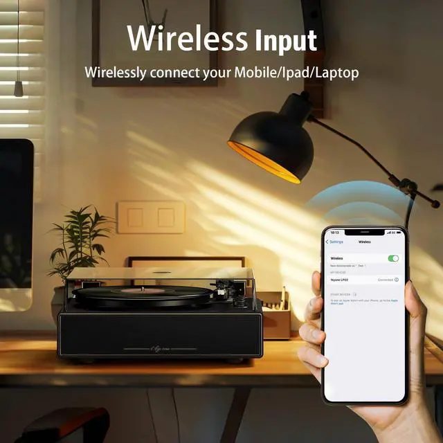 Wireless Record Player: This record players wireless input capability allows you to wirelessly stream music from your smartphone, tablet, or other wireless-enabled devices, giving you the flexibility to enjoy your digital playlists as well as your vinyl ^^ Belt-Drive System & 2