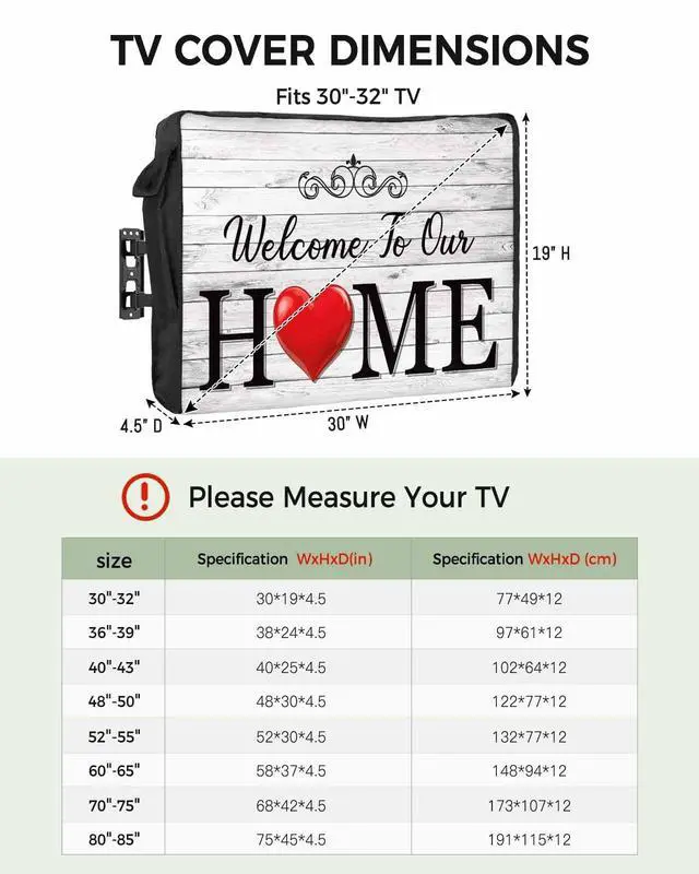 Size for Choose: 30x19x 4.5 inch, for 30-32 inch TV28x24x 4.5 inch, for 36x39 inch TV40x25x 4.5 inch, for 40x43 inch TV48x30x 4.5 inch, for 48x50 inch TV52x30x 4.5 inch, for 52x55 inch TV58x37x 4.5 inch, for 60x65 inch TV68x42x 4.5 inch, for 70x75 inch TV75x45x 4.5 inch, for 80x85 inch TVPlease confirm your TV size before making a purchase. -- This outdoor tv covers weatherproof can well protect your TV from the rain, sunlight, UV rays, wind, snow and outdoor elements and helps keep the dust off and the screen clean. --This tv covers outdoor has slits and opening area in the back so the wall mount arm can fit through, the slit areas have hook and loop to seal up ensures durability and longevity compared to zippers, easy to install and take off. -- A side pocket on both sides of waterproof tv cover for outside to store your remote control, it can well protect the remote control and you can easily access it when you need it. -- This tv protective cover is easy to care for, machine washable with cold water, gentle cycle.