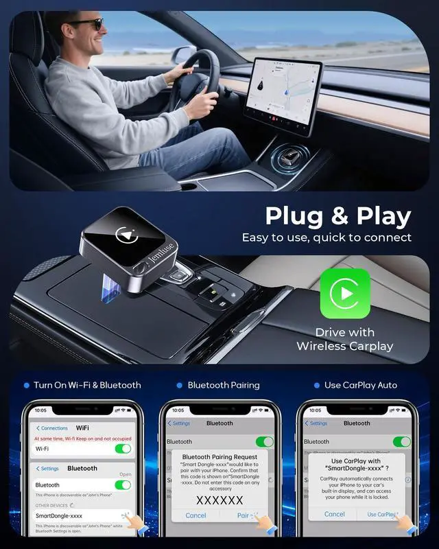^^ Smart Setup & Multi-Device Support Easy 5-step setup with auto-reconnect every time you start your car. Supports pairing with multiple iPhones and automatically connects to the last used device. ^^ Enhanced Connectivity & Audio Control Utilizes both Bluetooth for initial pairing and Wi-Fi for stable data transmission. Includes adjustable audio streaming modes to optimize sound quality for different car models. ^^ Widely Compatible & Wired CarPlay Only Compatible with 98% of OEM wired CarPlay systems. Supports iPhone iOS 12 and above. Designed exclusively for cars with built-in wired CarPlay. Lifetime free firmware updates ensure your device is always up-to-date.