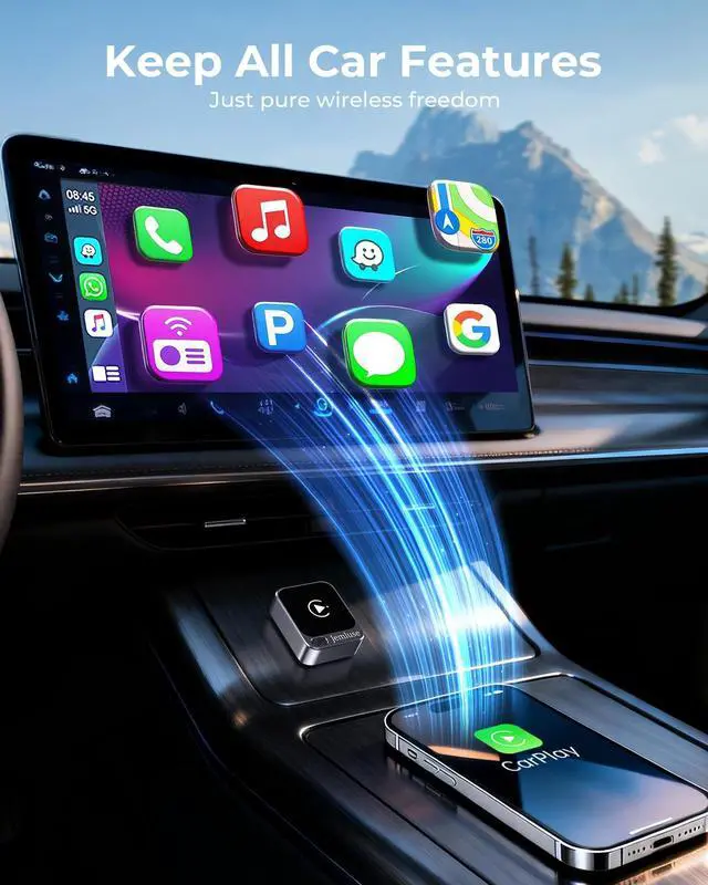Seamless Wireless Conversion & Powerful Performance Experience ultimate wireless freedom. This adapter instantly upgrades your wired CarPlay to wireless, eliminating cable clutter. Powered by an advanced 8-core processor and 5.10GH z Wi-Fi, it ensures zero-latency audio and ultra-fast transmission for smooth navigation, clear calls, and uninterrupted music streaming, making every drive smarter and more enjoyable. ^^ Durable Design & Stable Connection Made with aerospace-grade aluminum alloy and acrylic glass surface for durability. The snug fit design prevents loosening even during sharp turns or bumpy roads. Its minimalist style blends perfectly with your car's interior.