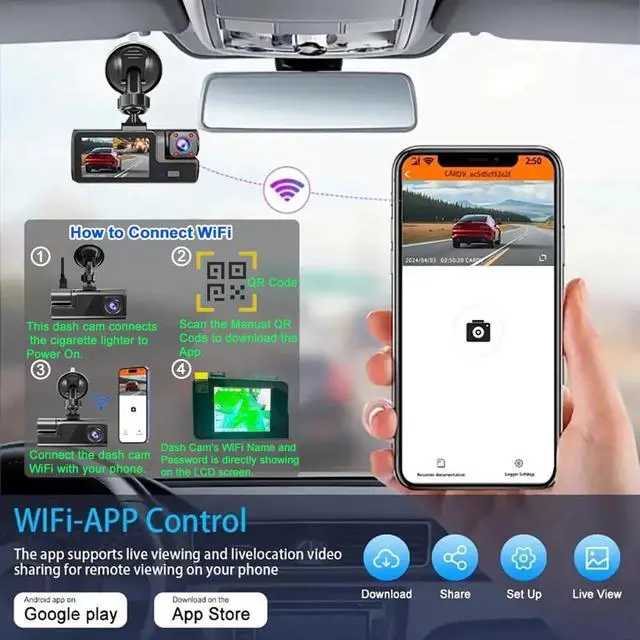 1080P WiFi Dashcams Wireless Dash Cam with AppThis Wireless 1080P Dash Cam comes with App, it is very easy to conenect dash cam WiFi, Dashcam's WiFi name and password is showing on the screen, connect with your mobile phone, then can check video in the mobile phone.